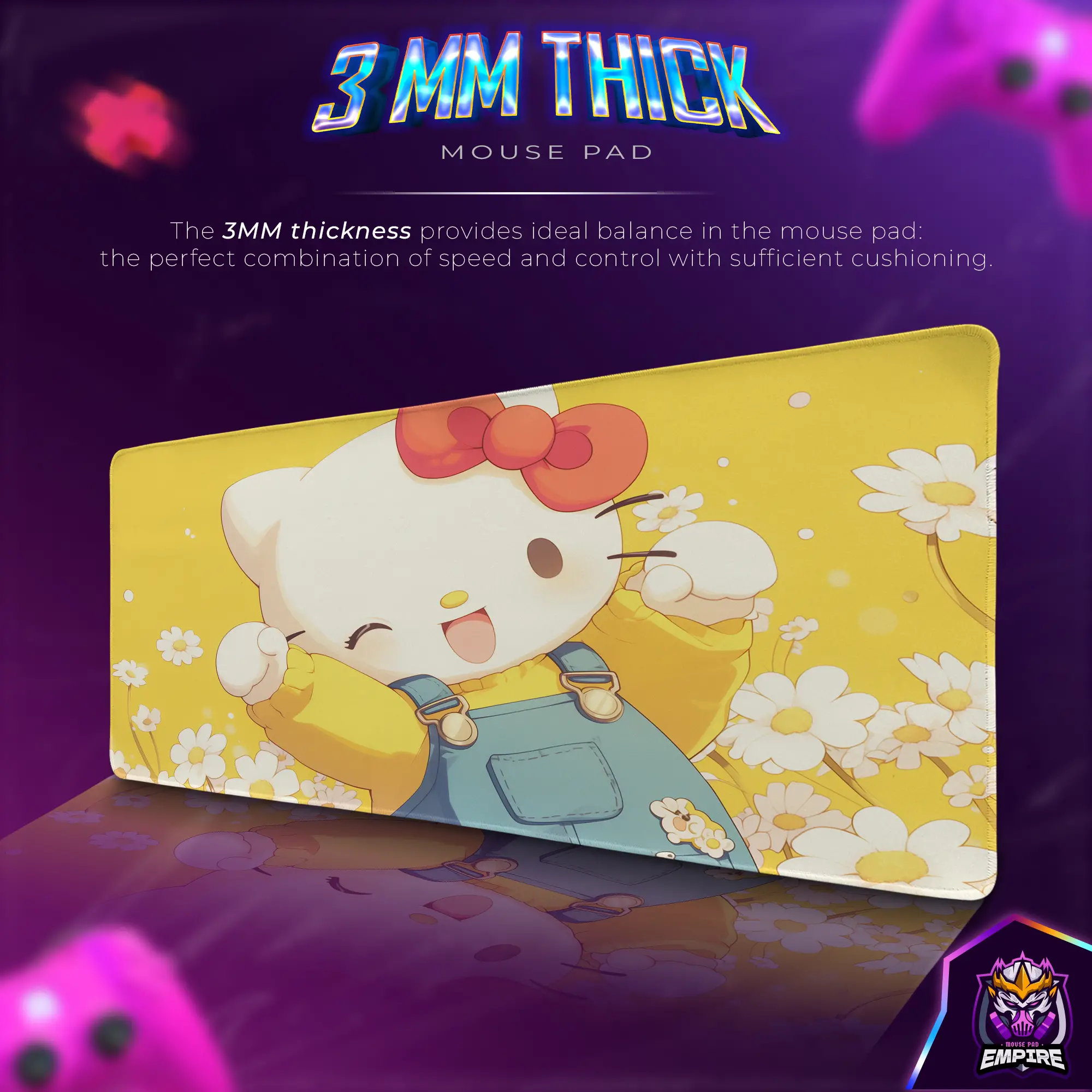 Set in a soft pink and cream backdrop with scattered white blossoms, Hello Kitty sits peacefully at the center, smiling as butterflies flutter past and petals dance in the breeze. It’s a design that captures the warmth of spring mornings, the comfort of familiarity, and the joy of gentle, timeless aesthetics. Whether you’re working, gaming, journaling, or just enjoying some quiet time at your desk, this mat adds a sense of calm and delight to every moment.